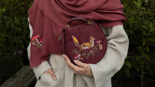 FABLE Mushroom Embroidered Burgundy Pashmina Scarf
