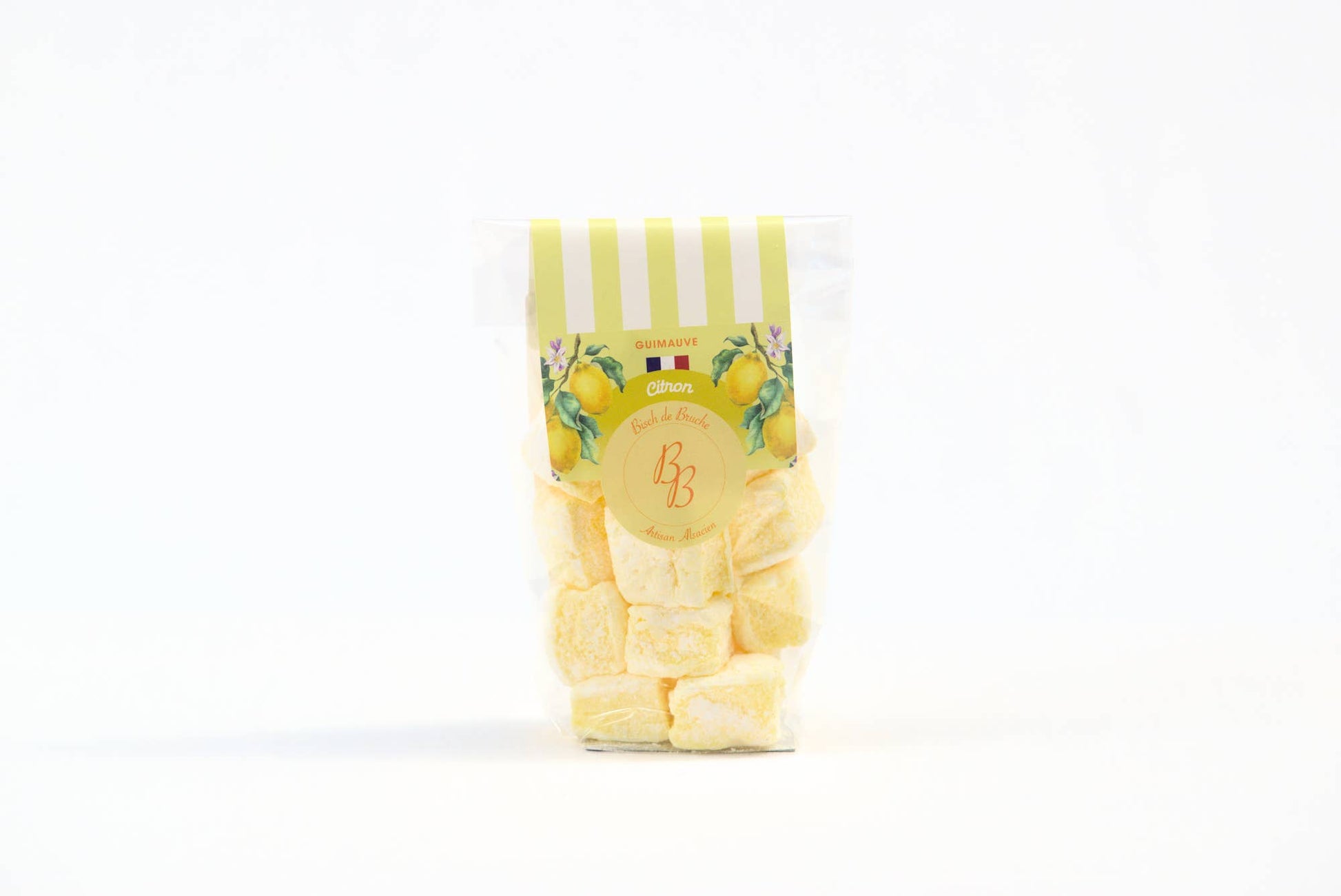 Disse håndlagde sitronmarshmallowsene fra Bisch de Bruche er lette, myke og friskt smaksatt med sitron. Den fine balansen mellom mild sødme og frisk syrlighet gir en ren og behagelig smak som ikke blir for tung.