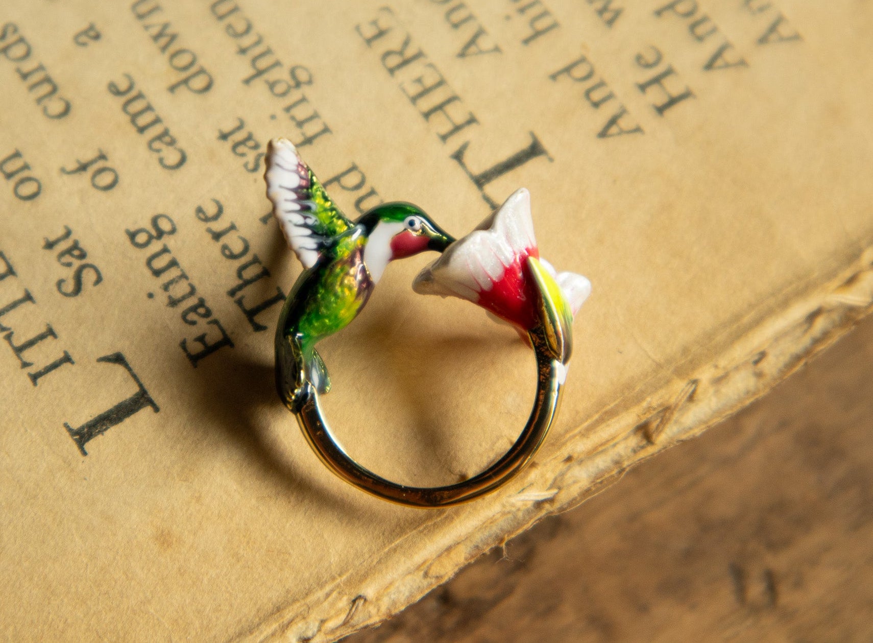 Oppdag den utsøkte Hummingbird Ring fra Bill Skinner – et vakkert symbol på liv, kjærlighet og glede. Ringen er rikt dekorert med håndmalt emalje og gullbelagt finish som fremhever de fine detaljene i det livlige kolibrimotivet.